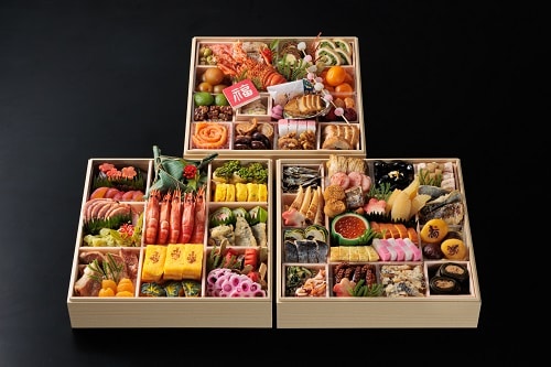 友禅包み麩 / 紫花豆旨煮 / 紅白かるかん / くるみ甘露煮 / 子持いか煮 / 若桃甘露煮 / 子持昆布彩り和え /